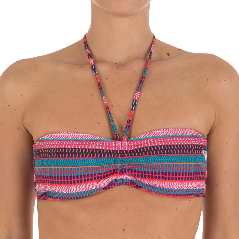 Haut de maillot de bain femme forme bandeau, avec lien cou. Dégage et valorise les épaules. Ajustable en tour de dos et cou. Renforts côté. Léger maintien. Coques amovibles.